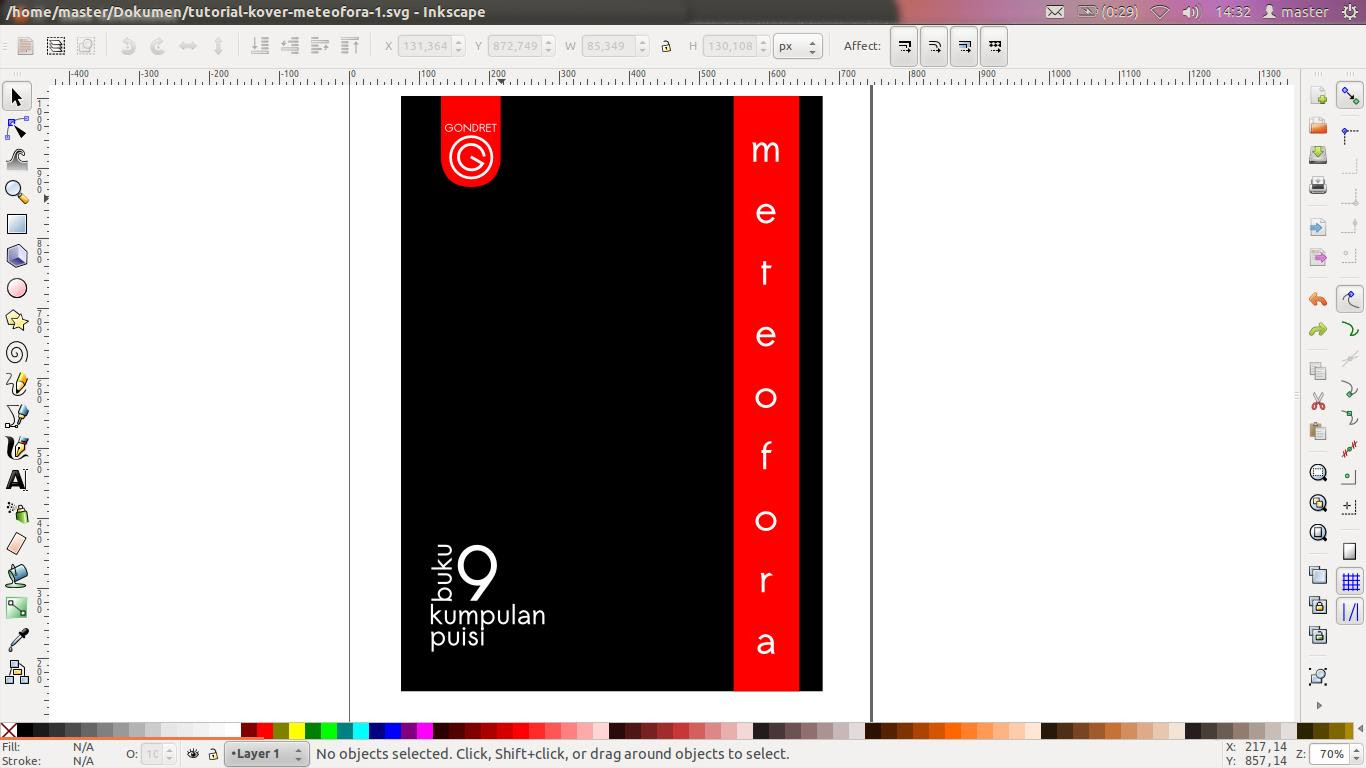 Buat juga persegi panjang memanjang ke bawah berwarna merah lalu letakkan di bagian kanan kover dengan sisa sedikit ruangan tepinya. Jika sulit, duplikasikan saja kover, lalu dengan Alt+Seret pada panah tengahnya ke kanan, lalu sesuaikan. Ini otomatis menjadikan ukuran lebarnya sama dengan kover hitam di belakangnya. Persegi panjang merah ini akan menjadi latar bagi tulisan tegak “meteofora”.